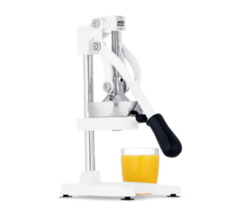 Focus Foodservice - Jupiter™ Juicer, manual, lever action, 27-1/2" overall height, rubberized handle & suction-cup feet, 3-pinion design, 18/10 stainless steel perforated strainer cone & funnel, cast iron, white enamel finish, NSF