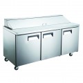 Grista Refrigerated Salad/Sandwich Prep Table, 3-section, 70-1/4"W x 29-1/2"D x 42-1/4"H, 18 cu.ft., rear mount self-contained refrigeration, digital temperature controller with LED display, auto defrost, 33° to 41°F temperature range, (3) adjustable plastic coated wire shelves, insulated hinged lid, 10-1/4" deep x 3/4" thick polyethylene cutting board, (3) self-closing doors with recessed handles, painted aluminum interior, 430 stainless steel exterior, (4) 4" casters (2 locking, 2 non-locking), R290 refrigerant, 3/4 HP, 115v/60/1-ph, 8.6 amps, NEMA 5-15P, cETLus, ETL-Sanitation (clear plastic food pans included) (special order, container buy only)