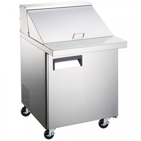 Grista Refrigerated Mega Top Salad/Sandwich Prep Table, 1-section, 27-1/2"W x 34"D x 46"H, 6 cu.ft., rear mount self-contained refrigeration, digital temperature control with LED display, auto defrost, 33° to 41°F temperature range, (1) adjustable plastic coated wire shelves, insulated hinged lid, 8" deep x 3/4" thick polyethylene cutting board, (1) self-closing door with recessed handle, painted aluminum interior, 430 stainless steel exterior, (4) 4" casters (2 locking, 2 non-locking), R290 refrigerant, 1/5 HP, 115v/60/1-ph, 4.4 amps, NEMA 5-15P, cETLus, ETL-Sanitation (clear plastic food pans included) (special order, container buy only)