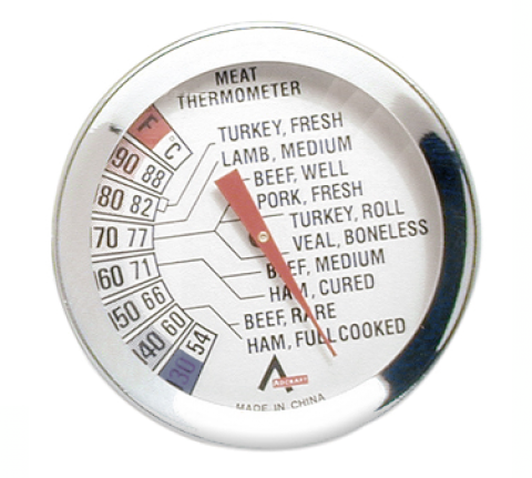 Meat Thermometer, 3" dia. dial, 130° to 190°F and 54° to 87°C, 4" heavy-duty metal stem, cooked temperature chart, stainless steel, NSF, HACCP, (LEAVE IN WHILE COOKING) blister packed