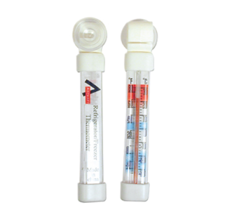 Freezer/Refrigerator Thermometer, 4-1/2"L x 1/2"W, impact resistant, shatterproof, temp range: -20° to 80°F and -20° to 0°C, plastic case with suction cup, NSF, HACCP