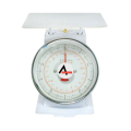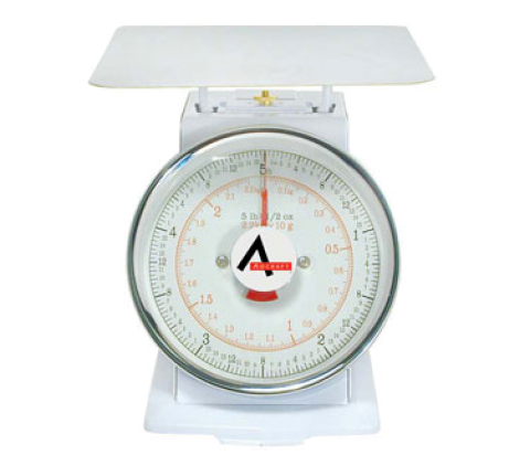 Portion Control Scale, dial type, 5 lbs. x .03 lbs. (80 oz. x 1/2 oz.) capacity, 7-7/8" square stainless steel platform, top loading counter model, dual read: U.S. and metric measurements, white