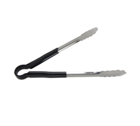Utility Tongs, 10", one-piece, scalloped edge, poly-coated color handle, heavy-duty stainless steel, black