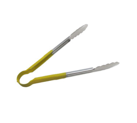 Utility Tongs, 10", one-piece, scalloped edge, poly-coated color handle, heavy-duty stainless steel, yellow
