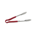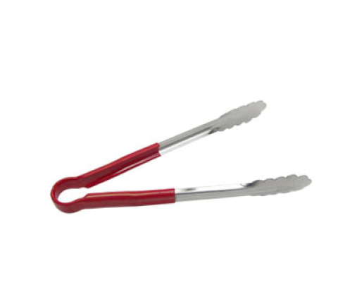 Utility Tongs, 12", one-piece, scalloped edge, poly-coated color handle, heavy-duty stainless steel, red