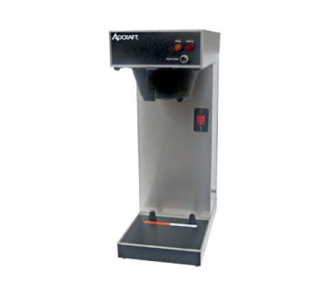Airpot Coffee Brewer, single brewer, 8.5" W x 14.5" D, 3.8 gallons per hour capacity, push button brewing, direct feed hook up for non-stop flow of coffee, fits airpots up to 14" tall, stainless steel construction, non-slip base, 120v, 1450 watts, 12 amps, NEMA 5-15