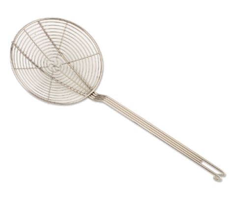 Skimmer, 9" dia. bowl, long hooked handle, full tinned, spiral wire, nickel-plated