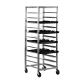 Room Service Tray Rack, Mobile, heavy duty, 72"H x 30"D x 23-1/2"W, open sides, 5" slide spacing, capacity (24) 15" x 20" round edge trays (2 per slide), square aluminum uprights, all welded aluminum construction, end loading, 5" dia. non-marking swivel casters, shipped fully assembled, 1200 lb. load capacity, NSF