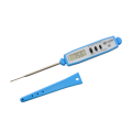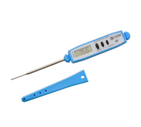 Thermometer, digital, blue, 2-3/4" stem, 6-1/4" overall length, -40° to 450° F (-40° to 230° C) temperature range, 1.5v battery, pocket clip, hook, water proof, antimicrobial, food safe, field calibration, shatterproof, plastic, stainless steel stem, NSF