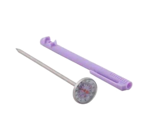Thermometer, allergen safe, 5" probe, 1" dial, 0° to 220° F (-18° to 104° C) temperature range, storage sleeve with built in recalibration wrench, shatterproof polycarbonate lens, purple, plastic, stainless steel probe, NSF