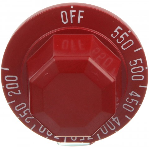 Dial, Thermostat, Red, 200-550F, Color: Red, Material: Plastic, Outer Diameter: 2" | 51 Mm, Temperature Range: 200 Degrees To 550 Degrees F, Note: Flat Down In Off Postition, D Stem: .187"