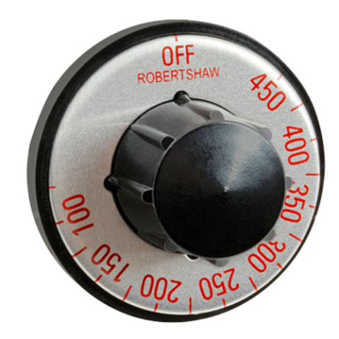 Electric Thermostat Dial, 100° to 450° F temperature range, heavy duty, fits standard .187 dia. D-stem, universal four-way mounting positions