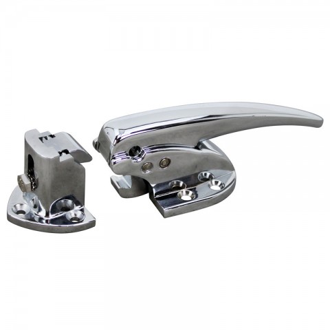 Mechanical Latch W/Strike, Polished Chrome, Curved Handle, No Lock, Offset 5/8" To 1-1/4", Length 7", Width 2-3/32", Outside Screw Centers 13/16" X 1-1/2", Strike W/3 Holes, Mount Hole Centers 29/32" X 1-1/2", With Hex-Head Bolt Adjustment., R30-9140-5/8, For Series: 9140, 2818,