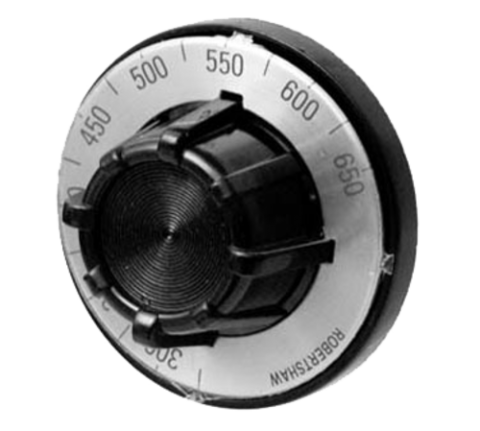 Thermostat Dial, 300° to 650° F temperature range, universal 4-way mounting, fit .29"D-stem, Robertshaw