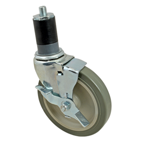 Caster, swivel stem, standard duty, 15/16"W, 5" dia., Ball Bearing, swivel, for 1-5/8" OD tubing with brake, metal non-marking wheel gray polyurethane tire