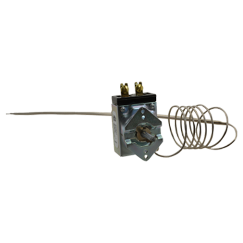 Thermostat, K-type 36" capillary, SPST, breaks at temperature rise, 250° F to 500° F temperature range, 3/16" x 14-1/2" bulb, screw terminals, 250v, 25 amp