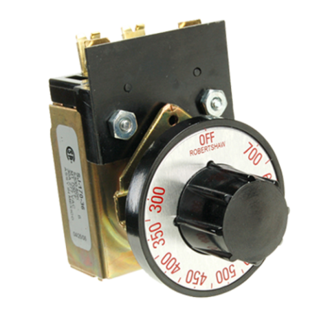 Thermostat, SJ-type, 36" capillary, SPST, breaks at temperature rise with auxiliary switch, 300° F to 700° F temperature range, 3/16" x 12-1/4" bulb, 277v, 30 amp
