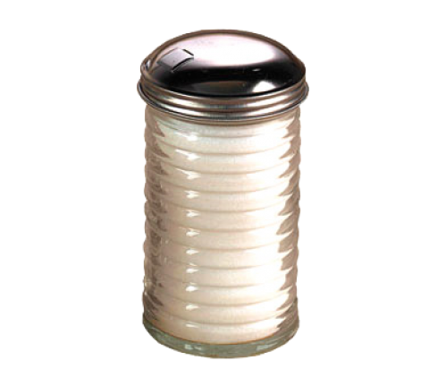 Sugar Pourer/Shaker, 12 oz., 3" dia. x 5-3/8"H, round, fluted, stainless steel self closing side flap top, dishwasher safe, glass, clear
