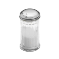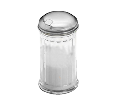 Sugar Pourer/Shaker, 12 oz., 3" dia. x 5-3/8"H, straight fluted, self closing flap, stain proof, dishwasher safe, stainless steel top, glass, clear