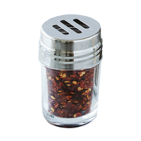 Shaker, 2 oz., 2" dia. x 3-1/8"H, stainless steel slotted top, glass, clear