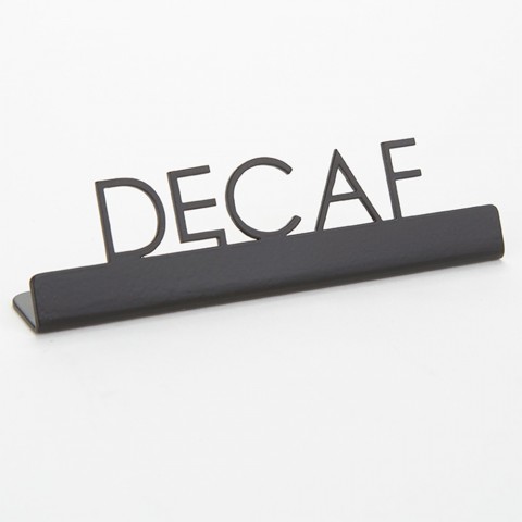Sign, "decaf", 5"L x 3/4"W x 1-1/4"H, 202 stainless steel, black