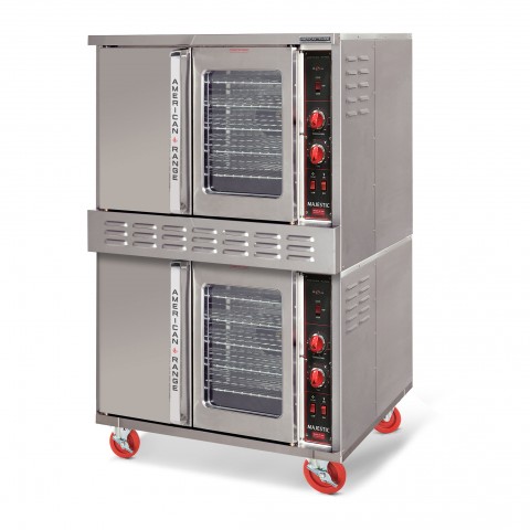 Majestic Convection Oven, gas, double-deck, standard depth, thermostatic controls, temperature range 150° F-500° F, one hour timer, 2-speed fan, porcelainized oven interior, 50/50 glass doors, stainless steel front, sides, top, stacking kit with casters (2 locking)12.0kW, 140,000 BTU, ETL, Made in USA