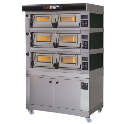 Moretti Forni Pizza Oven, electric, deck-type, (3) 49"W x 52"D x 7"H decks, (24) 12" or (18) 18" pizza capacity, (20) customizable programs (per deck), 840°F max operating temperature, (3) stainless steel bottom-hinged double doors, halogen lighting, refractory brick baking surface, stainless steel external structure, 51.0kW, CE, ETL, ETL-Sanitation, Made in Italy (MPN P120C03S)
