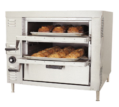 HearthBake Series Oven, countertop, gas, pizza/bake, double compartment, (2) 30"W x 26-1/4"D cordierite decks, 5"H upper deck/6"H bottom deck, center deck removable, (2) doors for each compartment, thermostat 650°F, stainless steel exterior, 4" legs with adjustable feet, 45,000 BTU, CE, cULus, UL EPH Classified