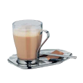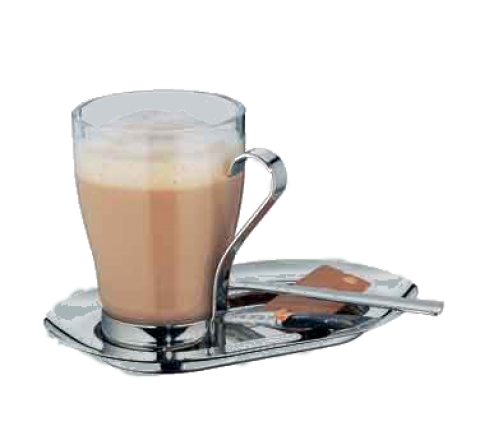 Milk/Coffee Set, includes: (6) 7-1/2" x 4-3/4" 18/10 stainless steel serving trays, (6) 11.2 oz. large glasses unprinted, (6) large 18/10 stainless steel handles & (6) 6-1/4" 18/10 stainless steel mug spoons, CoffeeCulture by WMF
