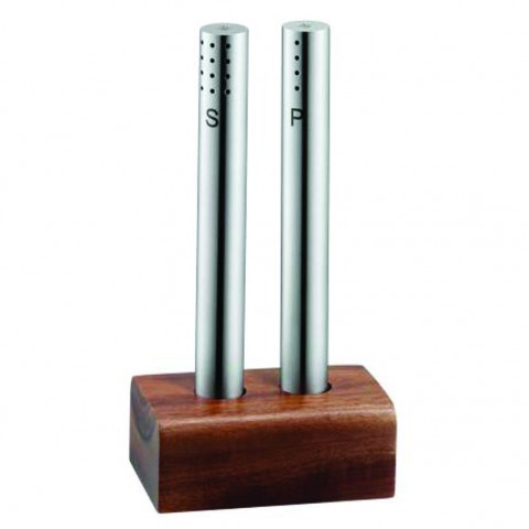 Salt/Pepper Set, 5-15/16"H, stainless steel canister, wood base, by WMF