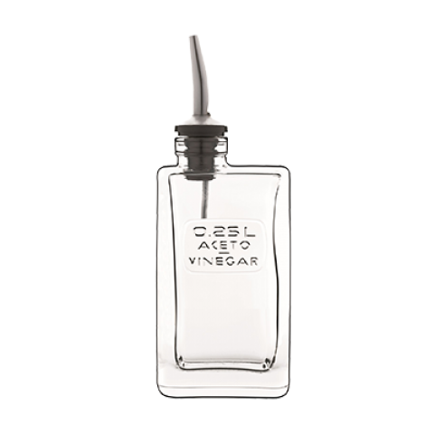 Vinegar Pouring Bottle, 8.5 oz. (9.5 oz. brimful), 3"L x 2"W x 7-3/4"H, embossed with CE gauge mark reflecting 0.25 liter capacity, with silicone/18/8 stainless steel pourer, glass, Optima® by Luigi Bormioli