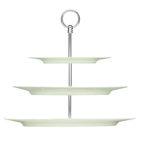Etagére, 10-5/8" dia. x 12-13/16"H, 3-tier, oval, flat, silver-plated stand, porcelain plates, bone white, Purity by Bauscher