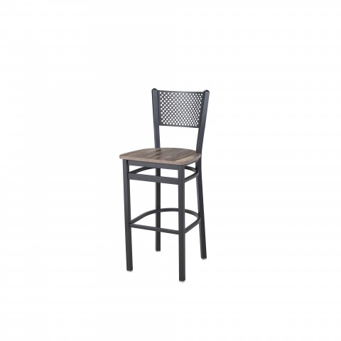 Polk Barstool, perforated back, farm house relic seat, footrest, steel frame with sand black finish