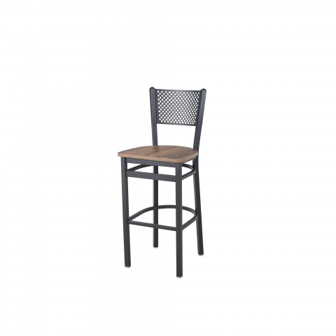 Polk Barstool, perforated back, knotty pine relic seat, footrest, steel frame with sand black finish