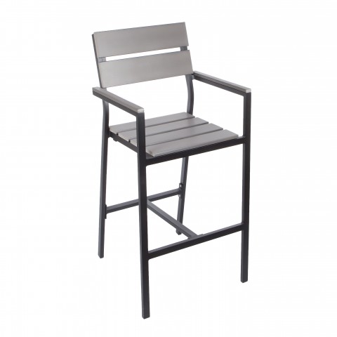 Seaside Barstool, wide, synthetic teak back, arms & seat ,outdoor/indoor, powder coated aluminum frame, black finish