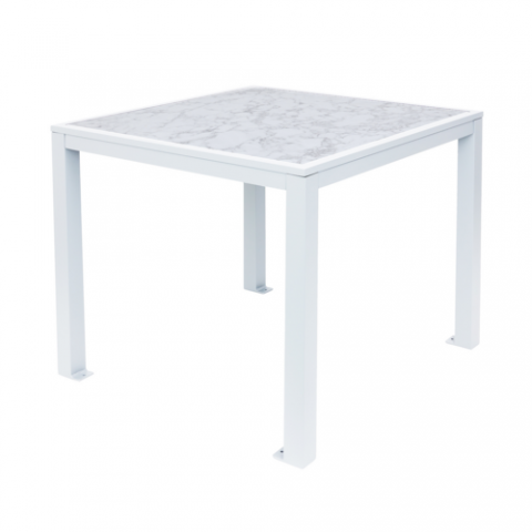 Surf Inlay Table, 32” x 32”, dining height, square, (4) leg, bolt down, HPL coating, Pietro top, white frame (umbrella hole optional)