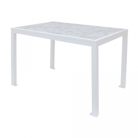 Surf Inlay Table, 32” x 48”, dining height, rectangular, (4) leg, bolt down, HPL coating, Carrara top, white frame (umbrella hole optional)