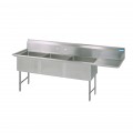 Sink, three compartment, 76-3/16"W x 23-1/2"D x 44-1/16"H overall size, 18” wide x 18” front-to-back x 14” deep compartments, 18" drainboard on right, 10"H backsplash, 8” OC splash mount faucet holes, 1-1/2” rounded front & side edges, includes basket drains, 16/304 stainless steel deck & bowls, stainless steel legs & side bracing, adjustable stainless steel over plastic bullet feet, NSF