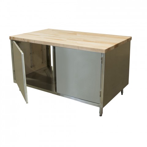 Dual Access Chef Table, cabinet base with hinged doors on both sides, 48"W x 30"D x 34-3/4"H overall size, 1-3/4" thick hard maple flat top with penetrating oil finish, 18/304 stainless steel body, (1) set of hinged doors on each side, 6” stainless steel legs with 1" height adjustment, stainless steel feet, NSF (3-10 day lead time)