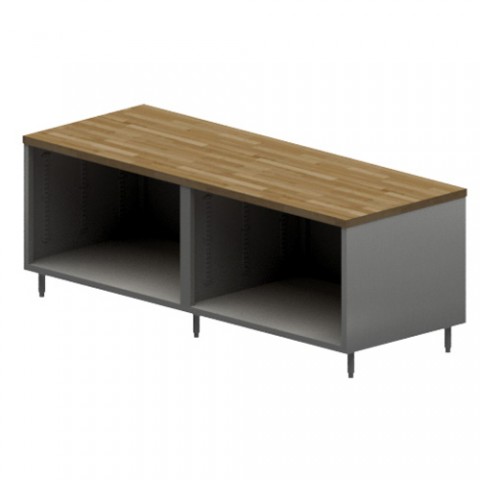 Chef Table, cabinet base with open front, 96"W x 30"D x 34-3/4"H overall size, 1-3/4" thick hard maple flat top with penetrating oil finish, 18/304 stainless steel body, center mullion, enclosed with stainless steel panels on sides and rear, 6” stainless steel legs with 1" height adjustment, stainless steel feet, NSF