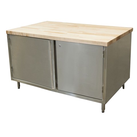 Chef Table, cabinet base with hinged doors & lock, 48"W x 36"D x 34-3/4"H overall size, 1-3/4" thick hard maple flat top with penetrating oil finish, 18/304 stainless steel body, (1) set of hinged doors with lock, 6” stainless steel legs with 1" height adjustment, stainless steel feet, NSF (3-10 day lead time)