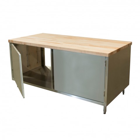 Dual Access Chef Table, cabinet base with hinged doors on both sides, 72"W x 36"D x 34-3/4"H overall size, 1-3/4" thick hard maple flat top with penetrating oil finish, 18/304 stainless steel body, (1) set of hinged doors on each side, 6” stainless steel legs with 1" height adjustment, stainless steel feet, NSF (3-10 day lead time)