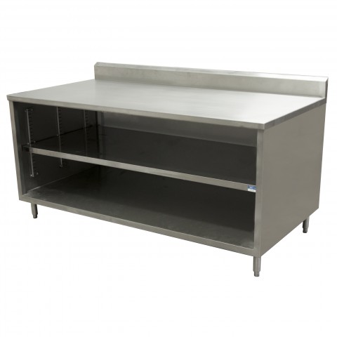 Chef Table, cabinet base with open front, 72"W x 30"D x 39-3/4"H overall size, 14/304 stainless steel top with 5" back riser, 18/304 stainless steel body, 6” stainless steel legs with 1" height adjustment, stainless steel feet, NSF