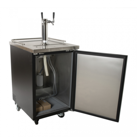 Kegerator Beer Dispenser, 24", (1) double head tap, 4” casters, (1) door, (1) tower, (1) keg capacity, electronic control system, self closing doors with locks, eco-friendly hydro-carbon refrigerant, temp range 33ºF to 41ºF, black vinyl exterior, ETL, ETL sanitation