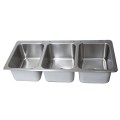 Drop-In Sink, three compartment, 55-3/4"W x 25"D x 12"H overall size, (3) 16" wide x 20" front-to-back x 12" deep compartments, (2) sets of 4" OC deck mount faucet holes, includes (3) basket drains (BKDR-4), 18/304 stainless steel construction, NSF