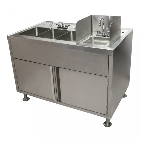 All-in-One Food Truck Wash Station, 48"W x 29"D x 42-1/8"H overall size, (1) three-compartment sink with (3) 10" wide x 14" font-to-back x 10" deep bowls, (1) hand sink with 9" x 9" x 5" deep bowl and side splashes, removable perforated drainboards, (2) hinged doors cover 44-3/4"W x 27"D x 16"H storage area, (4) mountable flange feet, adjustable up to 1-1/4", stainless steel construction