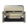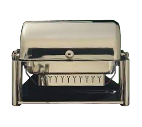 New Olympia Chafer, rectangular, 2 gallon, 27-1/4" x 17" x 12" open, closed 18-3/4", dripless cover & water pan, roll top opens half to full position, slow down feature on lid, windguard fuel holder, rubber pads, vent holes on cover, high polish stainless steel finish