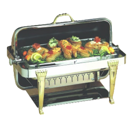 Elite Chafer, rectangular, 2 gallon, stainless steel with Aurora legs, handles & medallions, dripless water pan & cover, windguard, full roll down & halfway locking cover, slow down lock mechanism, brass coated hardware, Limited Lifetime Warranty