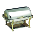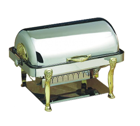 Elite Chafer, rectangular, 2 gallon, stainless steel with Lion legs, handles & medallions, dripless water pan & cover, windguard, full roll down & halfway locking cover, slow down lock mechanism, brass coated hardware, Limited Lifetime Warranty