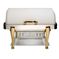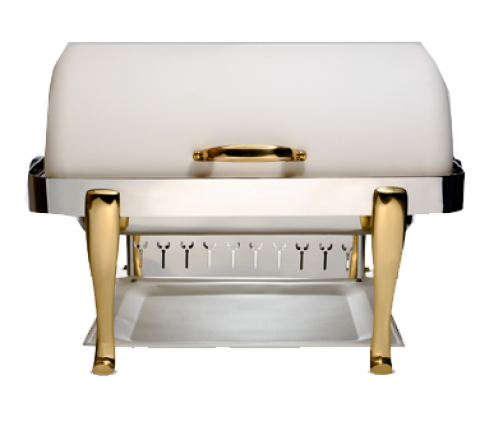 Elite Chafer, rectangular, 2 gallon, stainless steel with Roman legs, handles & medallions, dripless water pan & cover, windguard, full roll down & halfway locking cover, slow down lock mechanism, Bianco finish, Limited Lifetime Warranty